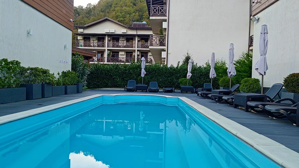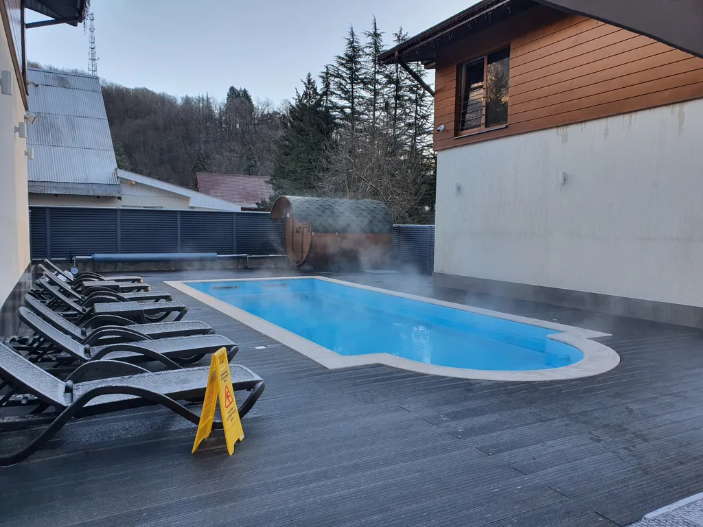 Панорамные виды на горы буквально с любой точки комплекса! Пышное озеленение на территории. Теплый бассейн и горячая сауна — особое удовольствие во время отдыха. Территория закрытая.