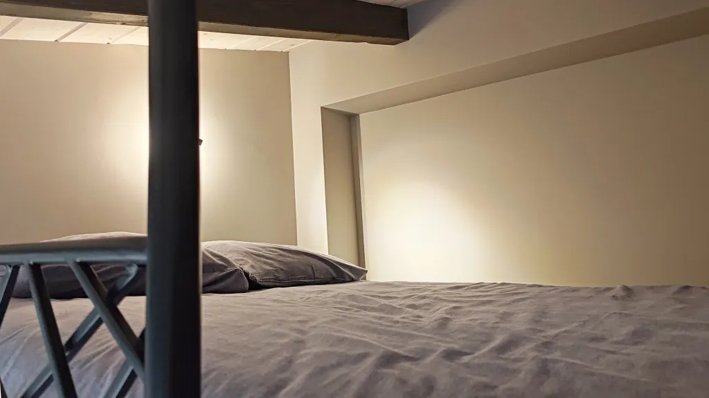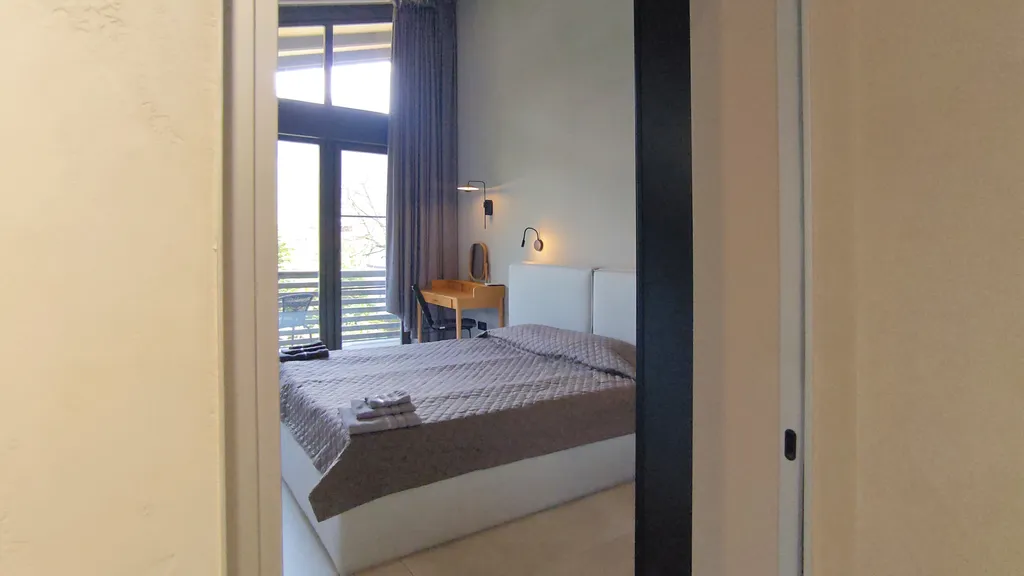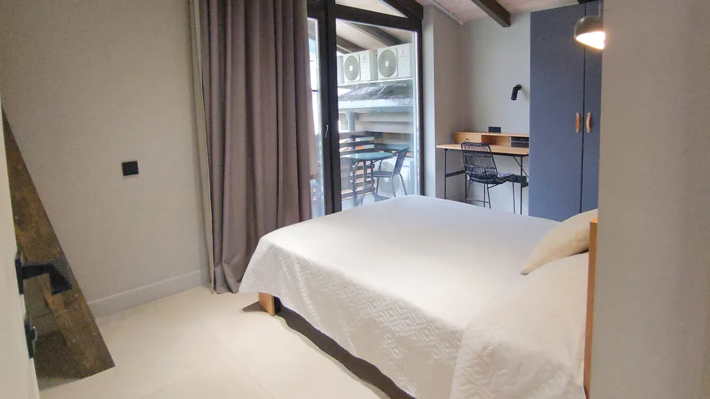 Двуспальная кровать 140*200. Рабочее место. На втором уровне спальни расположено отдельное спальное место 140*200. В спальне санузел с ванной. Автоматизированная система открытия штор. Панорамный окна с видом на горы и зеленый массив, выход на большой открытый балкон с мебелью