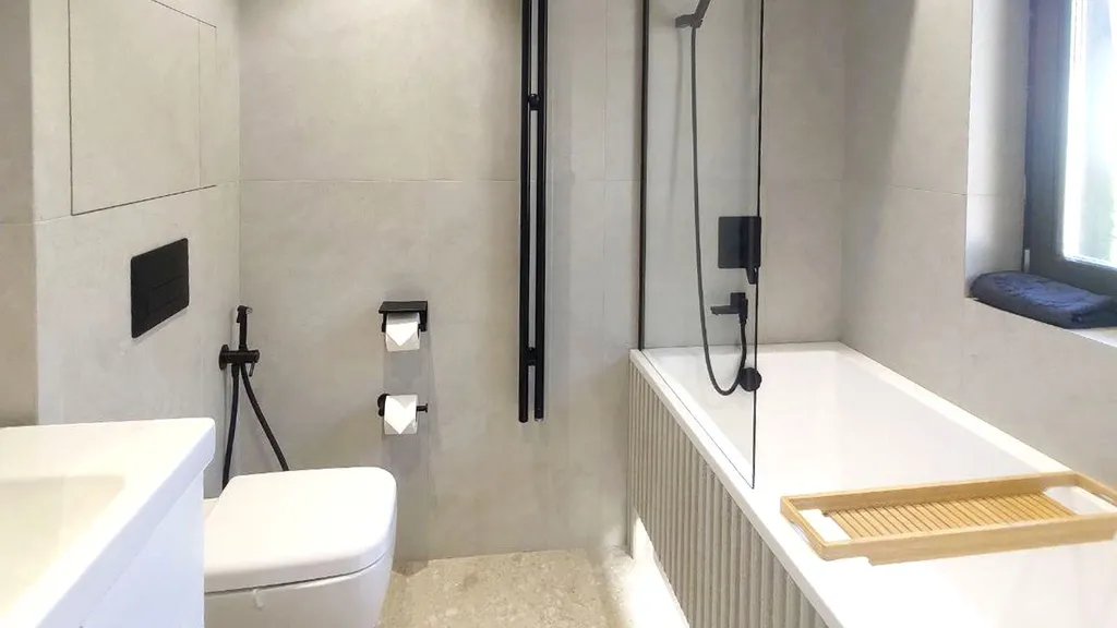 Ванная комната. Туалет с гигиеническим душем, ванна, раковина, фен. Косметические средства