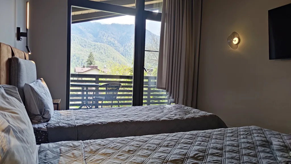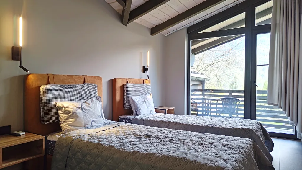 Две кровати 90*200. Панорамные окна с видом на горы и зеленый массив, выход на большой открытый балкон с мебелью. Автоматизированная система открытия штор. SMART TV