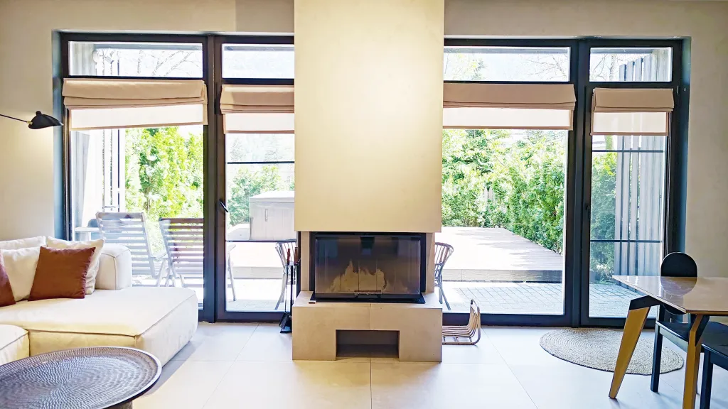 Гостиная – большой диван, смарт ТВ зона. Камин