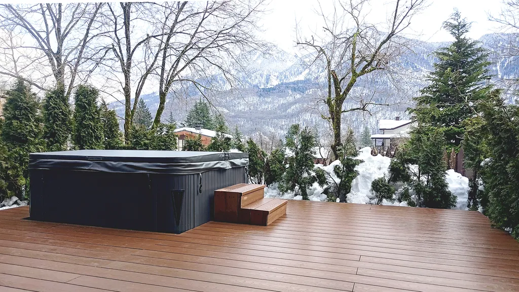 Дополнительные удобства: ТВ smart, Wi-Fi, стиральная/сушильная машины, утюг, гладильная доска, летняя мебель на балконах и террасах, барбекю. Джакузи с видом на горы