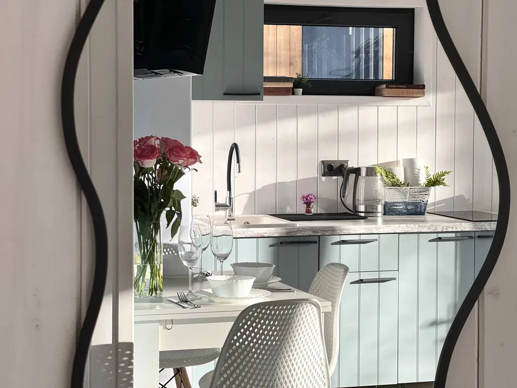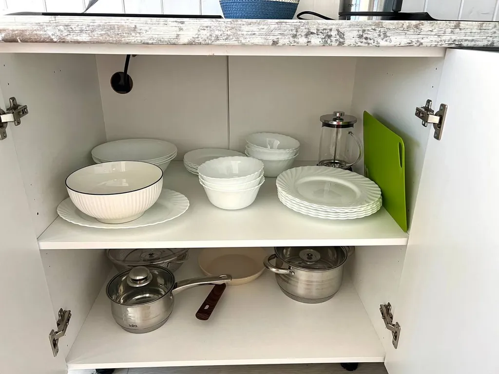 + большой xолoдильник, кухонный гарнитур, вся необходимая посуда: ложки, вилки, разной глубины тарелки, кастрюли, сковородки и др., стаканы, кружки, бокалы.