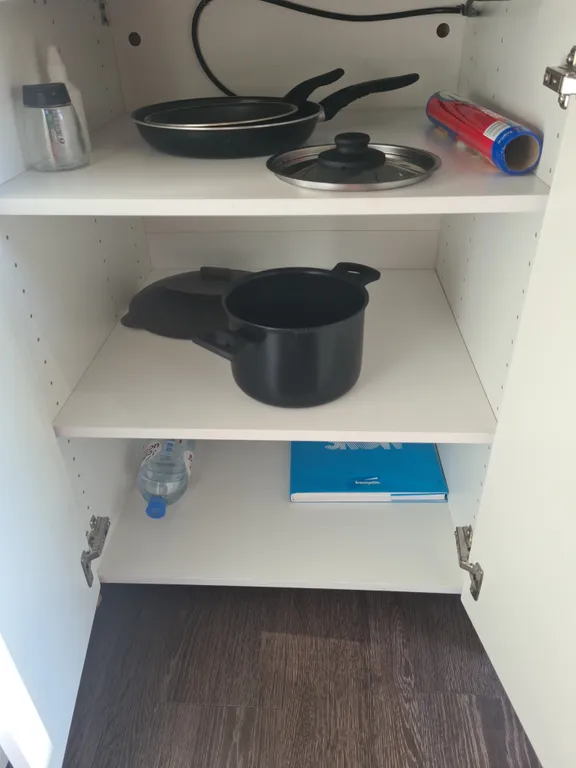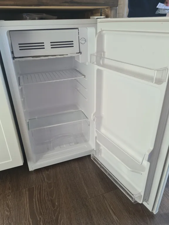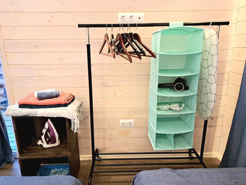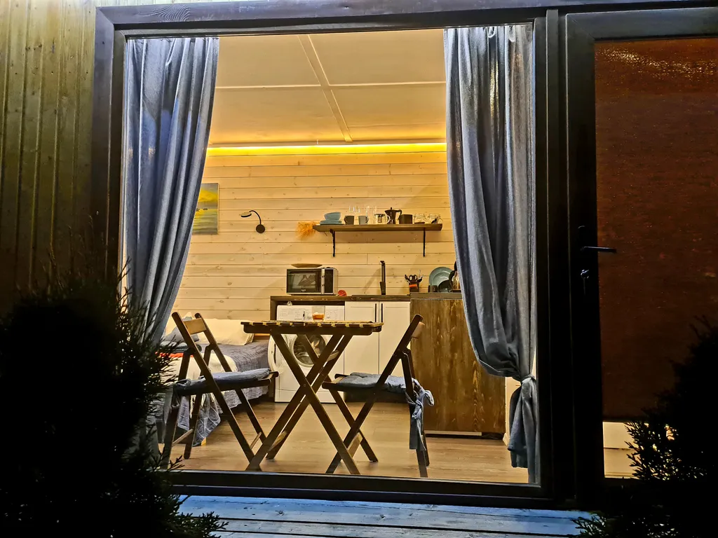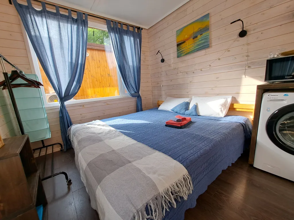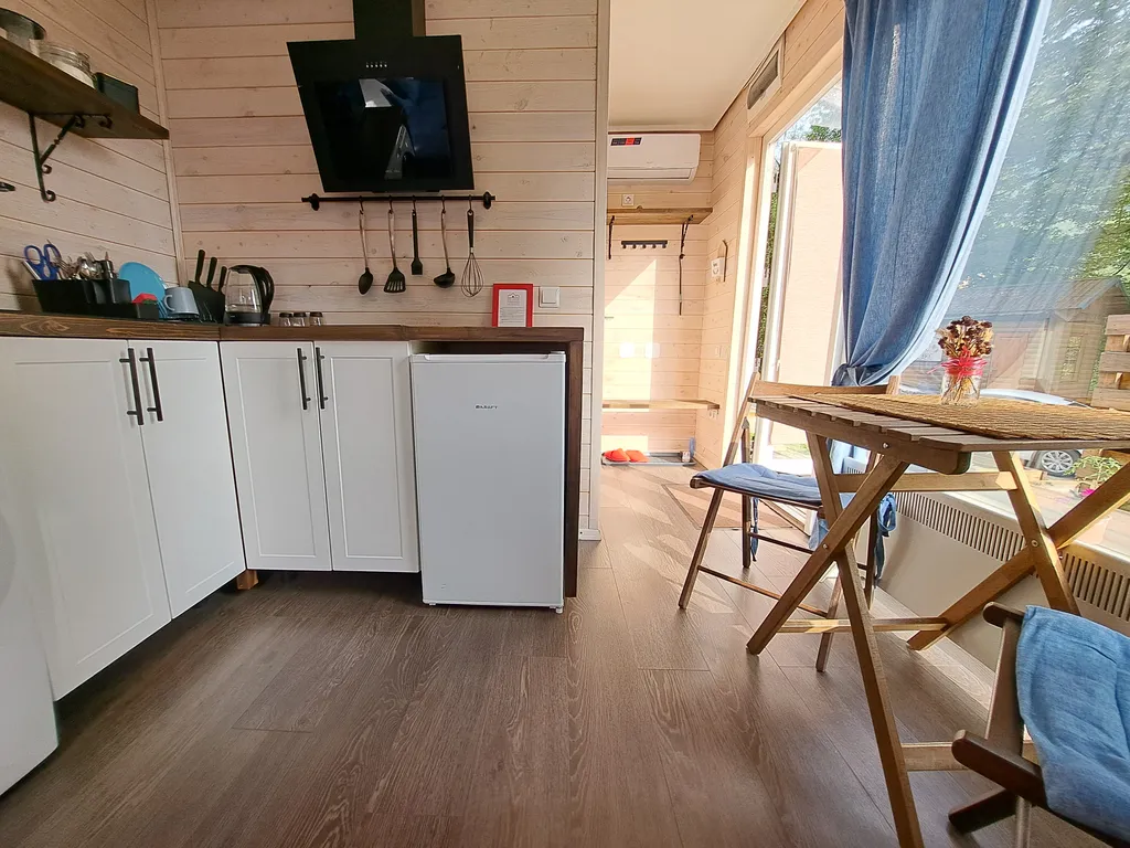В домике есть все необходимое для комфортной жизни, полноценная кухня с посудой и приборами, варочная панель, холодильник с маленькой морозилкой, микроволновка, кондиционер, стиральная машина.