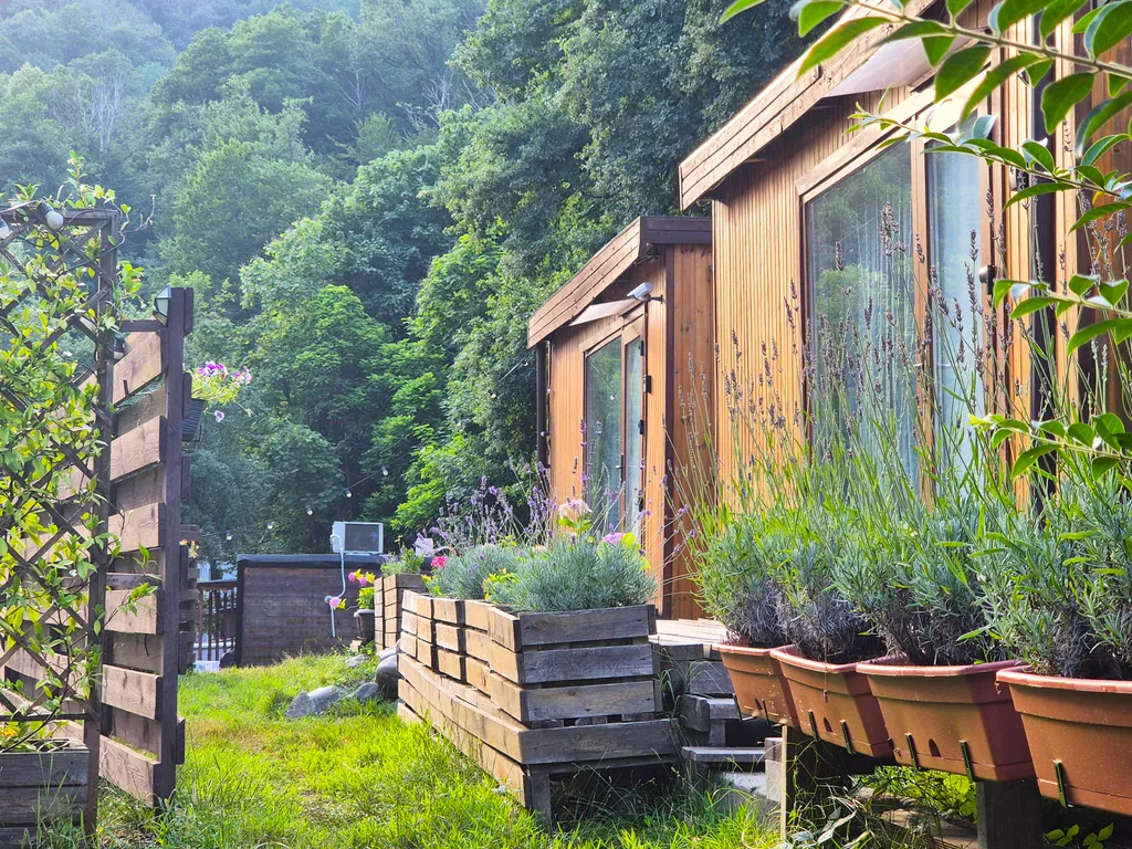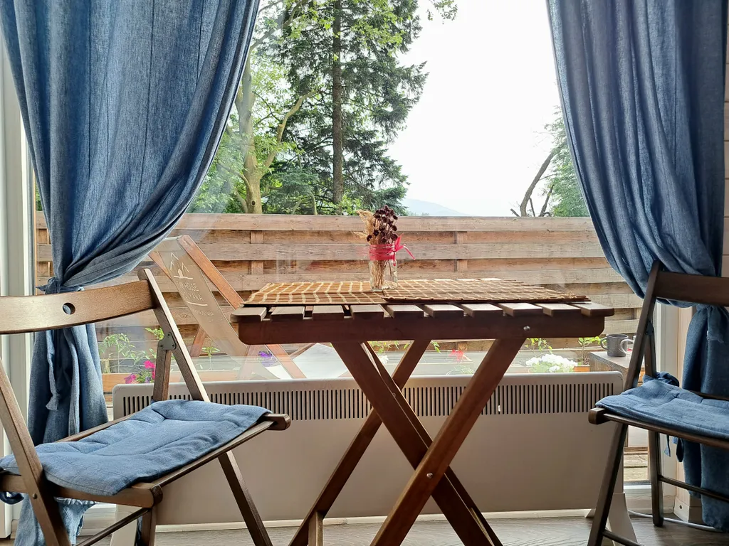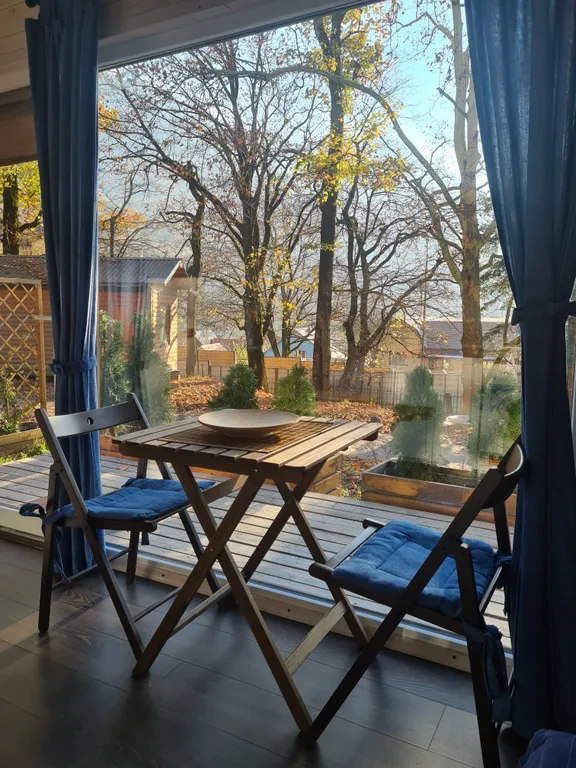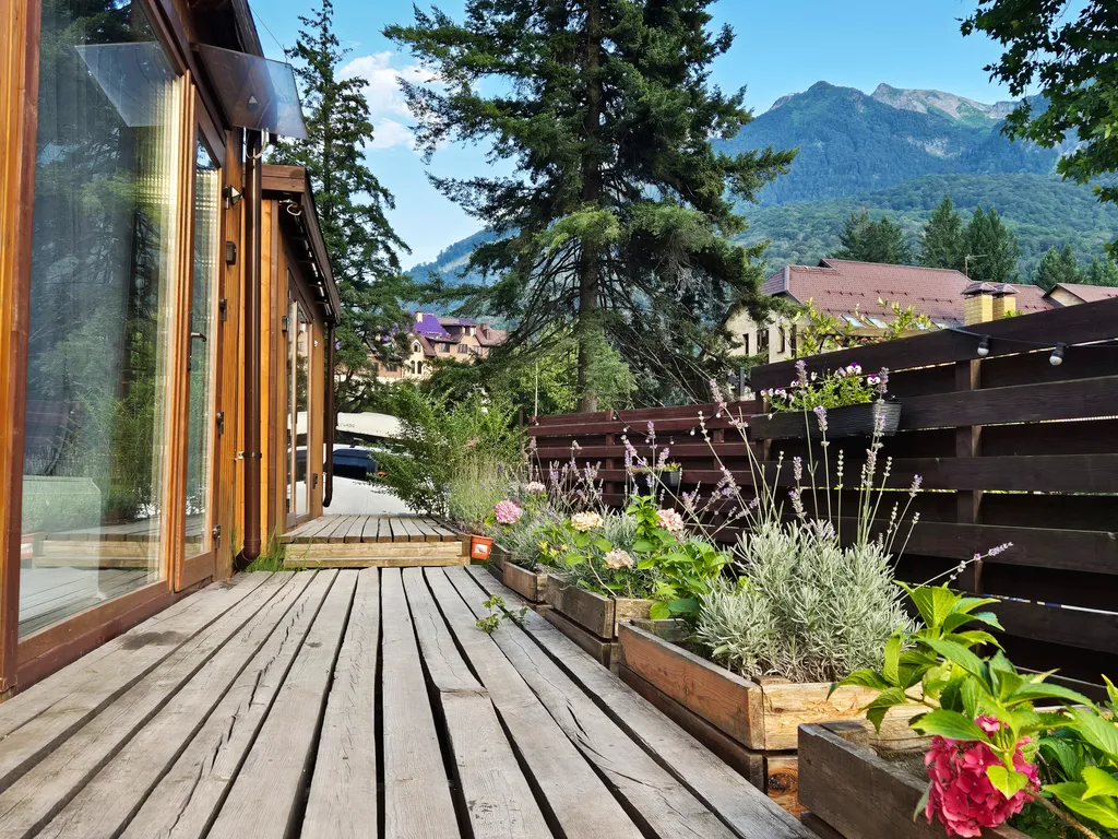 У домика свой маленький зелёный внутренний дворик и открытая терраса с которой открывается вид на горы. Бесплатная парковка прямо у домика. На открытой террасе и крыше домика можно загорать с потрясающими видами на горы или встречать закат на шезлонгах.