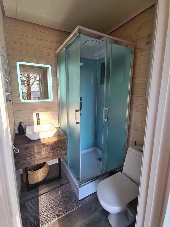 В домике стильный санузел с просторной душевой кабиной, всегда горячая вода от водонагревателя на 50л.