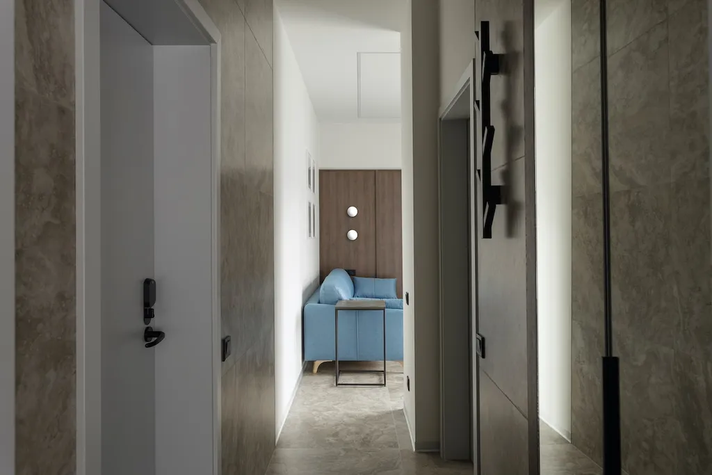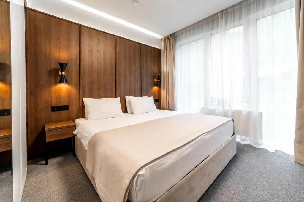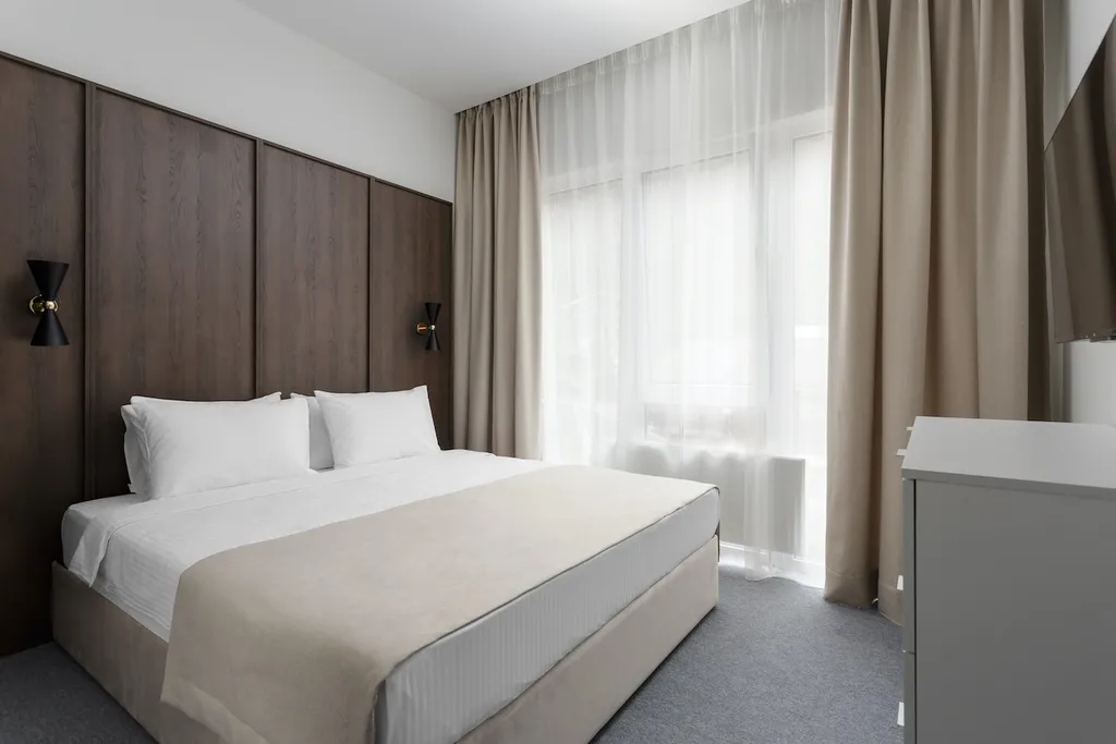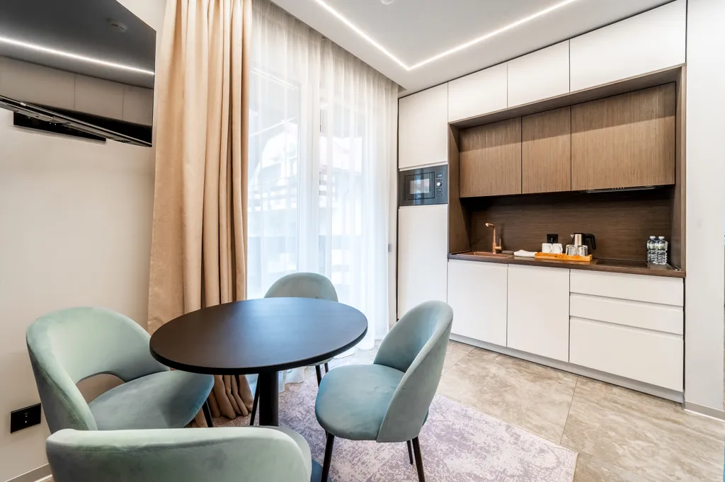В апартаментах есть: Wi-Fi, варочная панель, СВЧ, холодильник, сплит-система, управление температурой обогрева в помещении, TV с функцией Smart, обеденная зона, чайная станция (чайник, чай, сахар), фен, утюг, сейф. Апартаменты оснащены собственной ванной комнатой с душем, туалетом и косметическими принадлежностями.