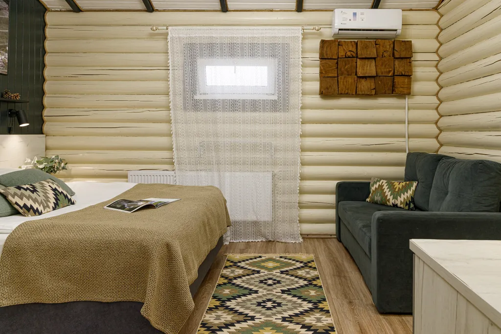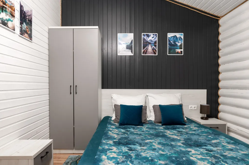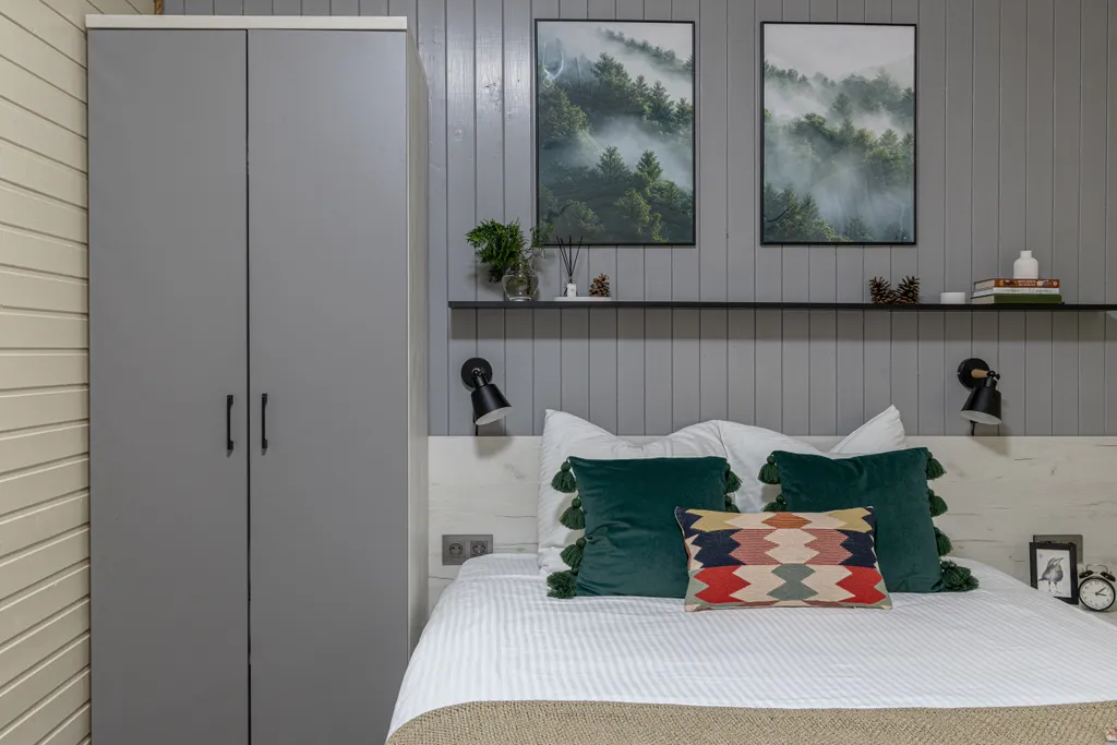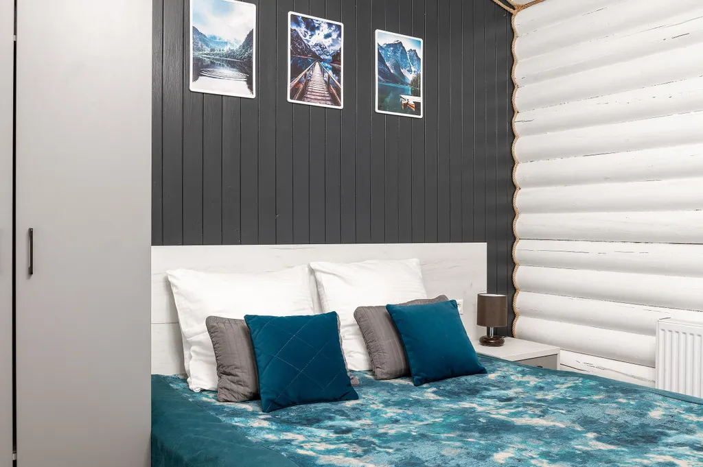 Спальная зона с большой двуспальной кроватью, двухместным раскладным диваном и уютными пледами.