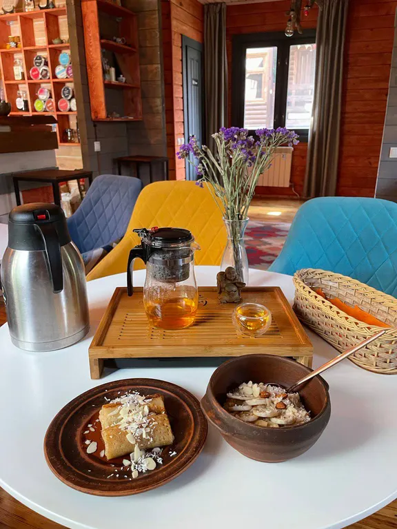 Вас ждет большой гостевой дом из сибирской сосны, уникальная кафе/чайная «солнце тибета», где вы сможете вкусно позавтракать, пообедать и поужинать. Волшебная банька “sunsvet” с нефритовым паром, массажем, спа-процедурами и уникальными авторскими парениями, перезагрузит, отправит вас в «космос» и полностью восстановит.