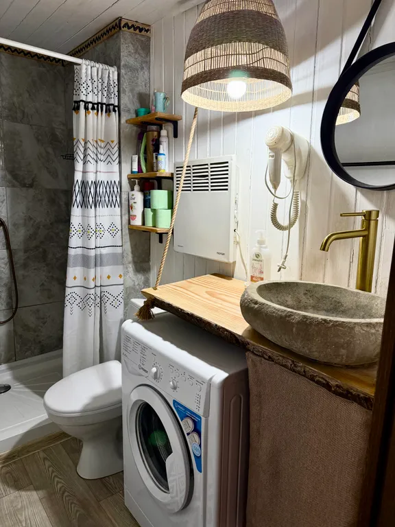 В домике есть всё, для комфортного отдыха: стиральная машина, утюг, фен, плита, посуда, санузел с душевой,